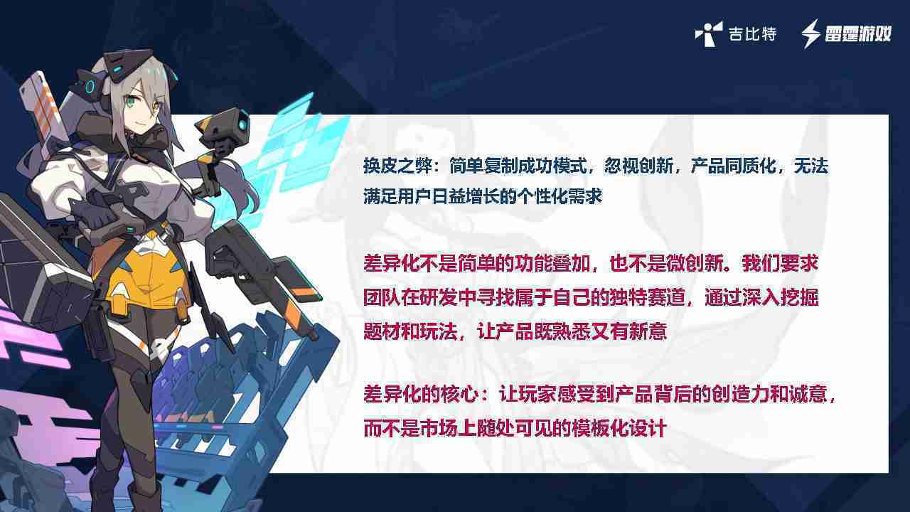在我们内部是这么定义差异化的。。。。首先,,,差异化不是简单的功能叠加,,,更不是换皮。。。只是换皮,,,产品无法提供有效的市场价值。。。。内部经常说差异化的产品不是为了迎合市场,,,,而是找到一个自己独特的表达方式,,,在研发中找到属于自己的细分赛道和独特赛道,,前提是需要对这个题材有足够的深入、、挖掘,,,对玩法有足够深入的理解,,让产品看起来既熟悉又有新意。。