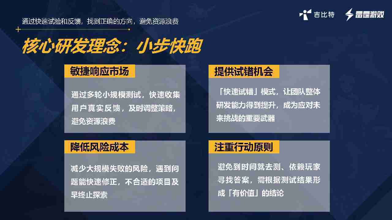 小步快跑不是找答案,,,而是验证答案。。。。我们之前有项目是这样的,,,,有些制作人会有几个方向觉得都可以做,,但是不确定做哪一个,,,,会选择几个都做,,做完拿到市场跑,,跑出哪一个更好,,基于这个再做后续的研发和拓展。。但这种情况最容易出现一个问题,,,可能被玩家裹胁,,,玩家说这个点不错、、那个点不错,,,,到底听还是不听,,,不听感觉是无视玩家的反馈,,,,听的话,,,可能自己没想清楚导致研发思路发生偏颇。。。所以针对这一点后面自己复盘整理,,,发现制作人自己心里要有数,,,要做自己觉得好玩的,,而且明确知道这个东西是你想做的,,,然后拿到市场验证这个答案是不是对的,,,而不是拿一堆答案找哪一个答案更好。。。