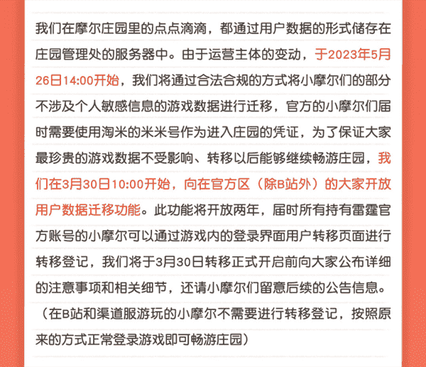 合作结束本就是开发方和代理方双方的事情,,降低这件事情对玩家的影响,,,,才是对所有珍视这段童年的摩尔玩家最好的呵护。。目前看来,,用户完全不用担心后续因无法登录游戏而造成任何数据上的损失,,,,只要及时进行账号转移,,就可以好好保留、、、、延续在庄园的痕迹和回忆,,继续在庄园里做快乐的红鼻子小鼹鼠。。。