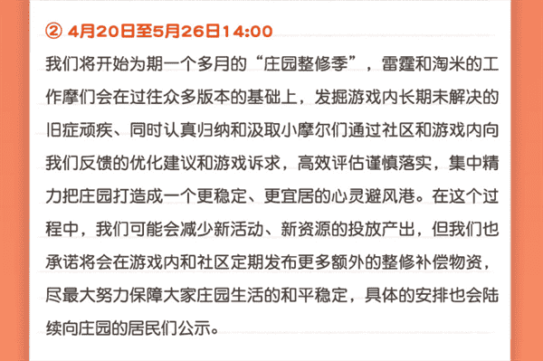 合作的结束并不意味着这个童年IP的结束,,,,对于《摩尔庄园》手游而言,,,,这是一个新阶段的开始。。后续游戏内将开启庄园重构计划,,,,会就以往遗留下来的BUG进行集中修复,,,并在游戏内和社区定期发布更多补偿物资。。。。