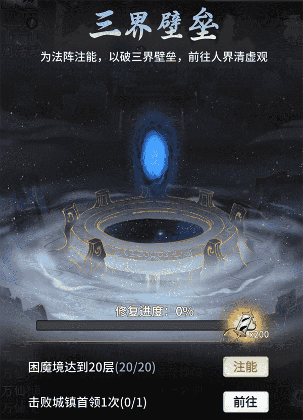 当你修为达到返虚/破虚中期后,,,,可在城镇寻得芸丫并激活神秘法阵,,通过收集材料、、、击败首领等方式为法阵注能,,,借以打破三界壁垒,,,开启支线剧情“清虚旧梦”