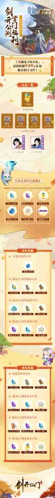 游戏为大家准备了海量的福利,,,包括上线即可获得的全渠道预约礼包、、、、十连抽等福利,,,,输入密令“JK666”、、、“JK888”即可领取紫色弟子,,,,达到金丹期后还有功法宝箱可领,,助力全宗上下实力提升……所有奖励总价值超过648元,,而邀请好友一起体验,,,,更可以获得额外的奖励哦~